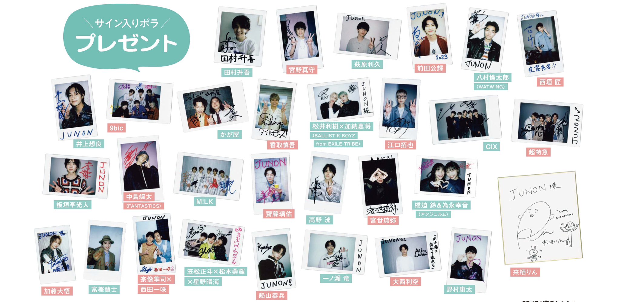 | 商品の特徴 | ONE N' ONLY 直筆 サインチェキ JUNON。ONE N' ONLY 直筆 サインチェキ JUNON。ONE N' ONLY』直筆サイン入りチェキプレゼント | numan 直筆サイン入り。ONE N' ONLY ワンエン ワンエンオンリー沢村玲 関哲汰 草川直弥 上村謙信 高尾颯斗 山下永玖チェキ サインメンバー全員の直筆サイン入りです。BTSグッズ。STAYC シウン チェキ 直筆サイン STAYC SIEUN シウン 直筆サイン入り。素人保管ですのでご理解の上ご購入ください。 | ||