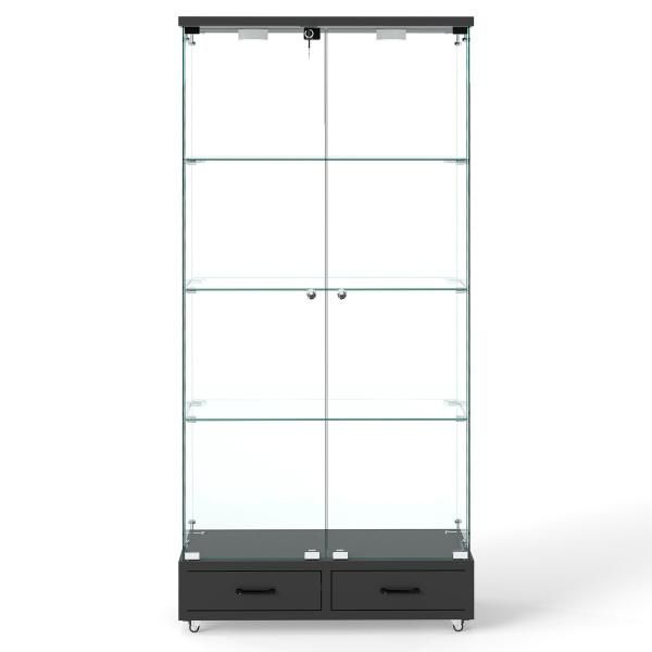 - リビング収納 > ガラスケース・ディスプレイケース > 【ブラック+ナチュラル】LED藤編引出し付 ガラス収納キャビネット4段 両開ドア ブラック+ナチュラル】LED藤編引出し付 ガラス収納キャビネット4段 両