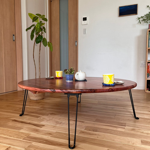 - 机・テーブル > 座卓・ちゃぶ台 > 国産杉の無垢材 角が丸くなめらか 折り畳み 丸形テーブル ちゃぶ台 チェリー色 つい触りたくなる国産杉の折り畳みちゃぶ台】直径90㎝ チェリー色 角が