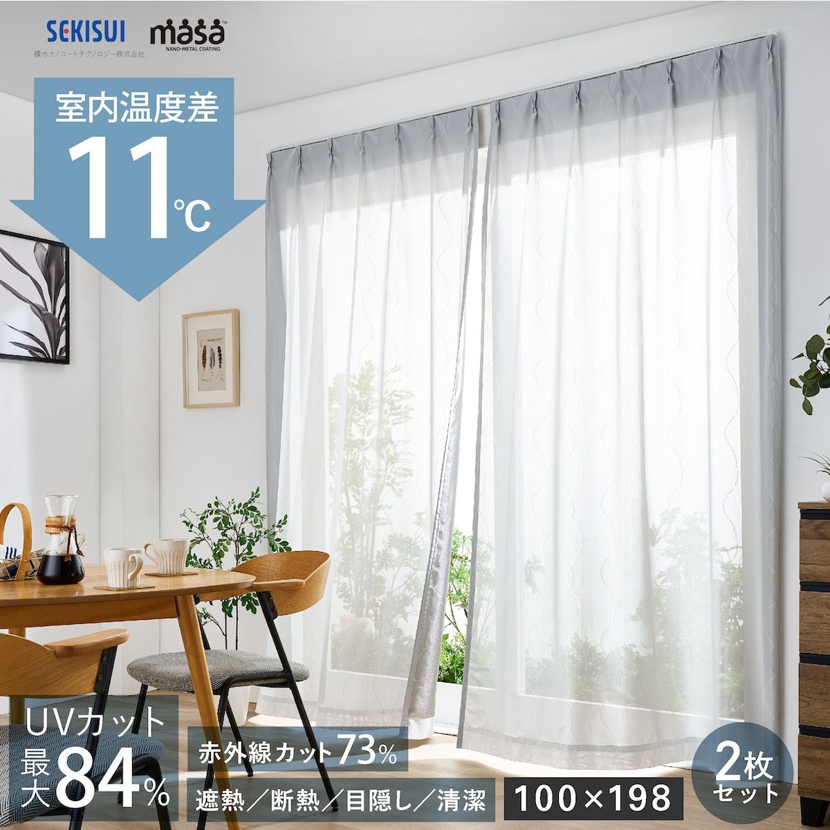 - カーテン・ブラインド > カーテン > レースカーテン 2枚組 断熱 保温 UVカット 100長さ x 176幅 cm 100x198cm】【2枚組】 遮熱レースカーテン masa 遮熱カーテン 2枚組