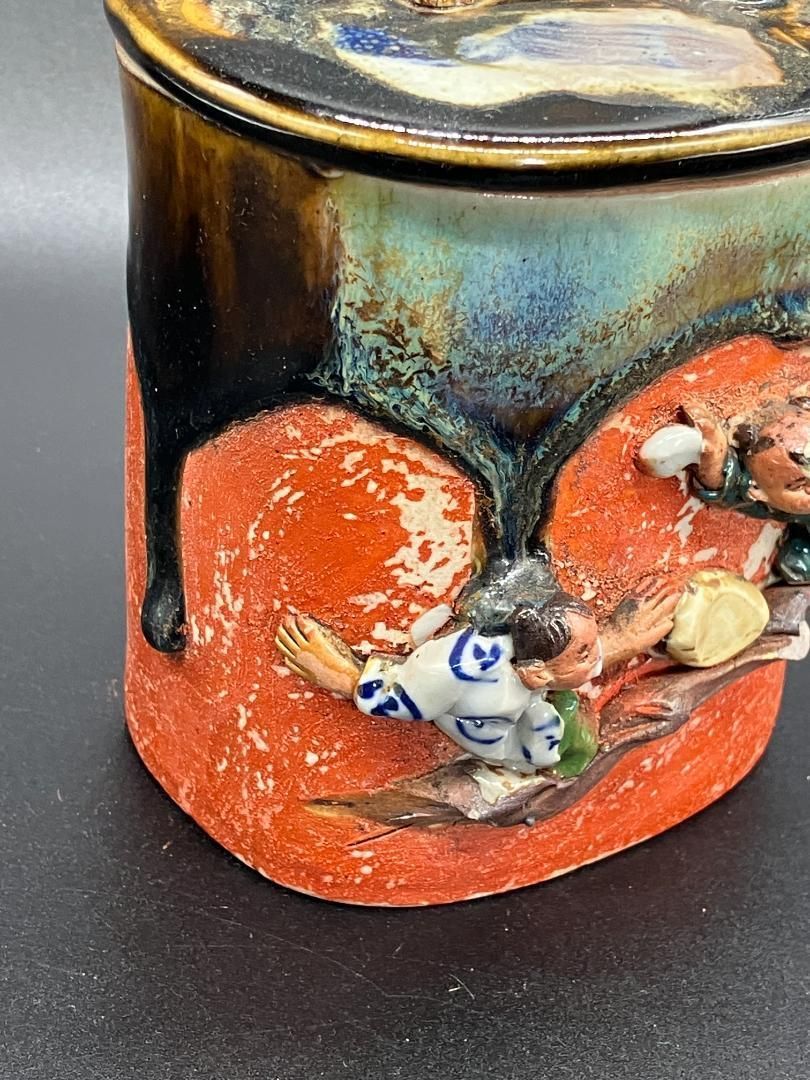 隅田焼 蓋物 井上良斎 高浮彫 人物文 水指 時代物 骨董品 古美術品 署名あり 隅田焼 蓋物 名工 井上良斎 幻の東京焼 高浮彫 人物文 水指 時代物