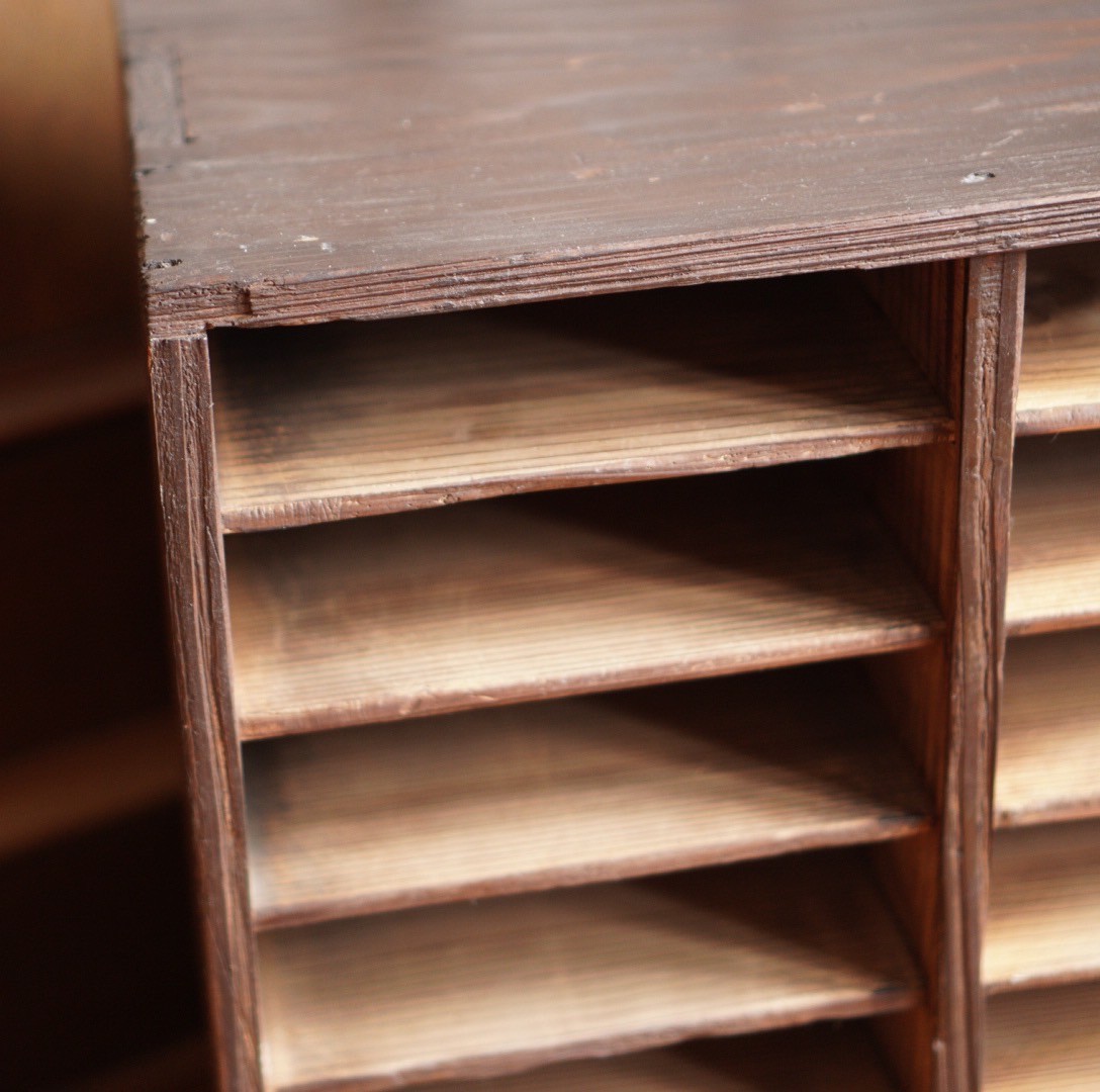 - 棚・ラック・シェルフ > 木製ラック・ウッドラック > 古家具ビンテージ品◾️木製家具 書類棚 カルテ棚 収納ラック 整理棚 古い書類棚 収納棚 木製 昭和初期 収納 古道具 アンティーク